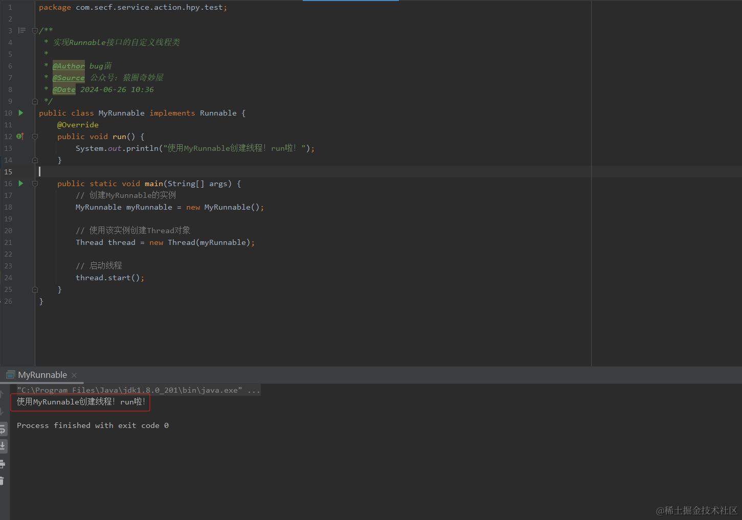 根据我如上给出的示例代码,这里我简单做个解析吧,这段代码展示了如何通过实现Runnable接口来创建一个线程。以下是对代码的解释: