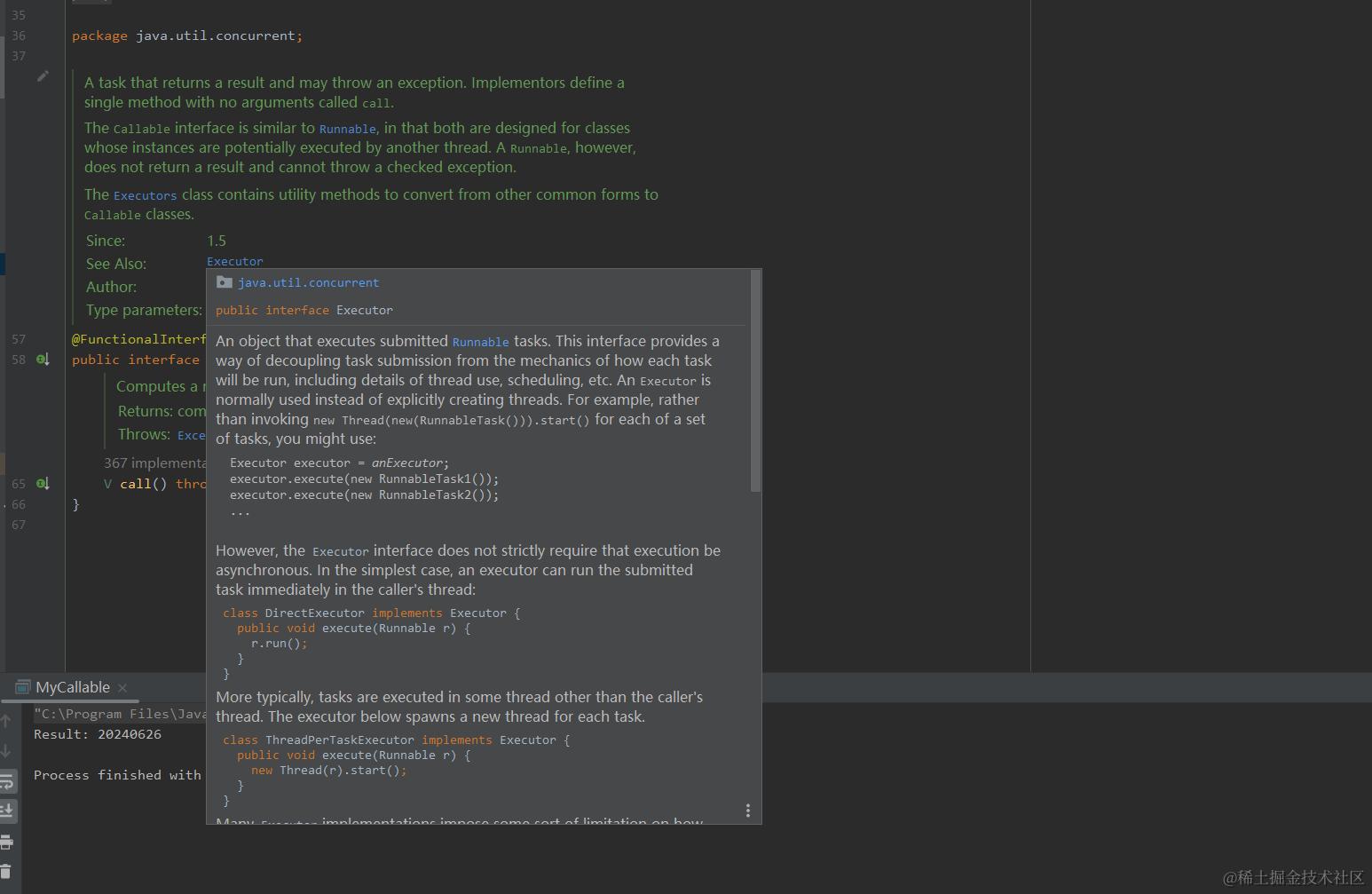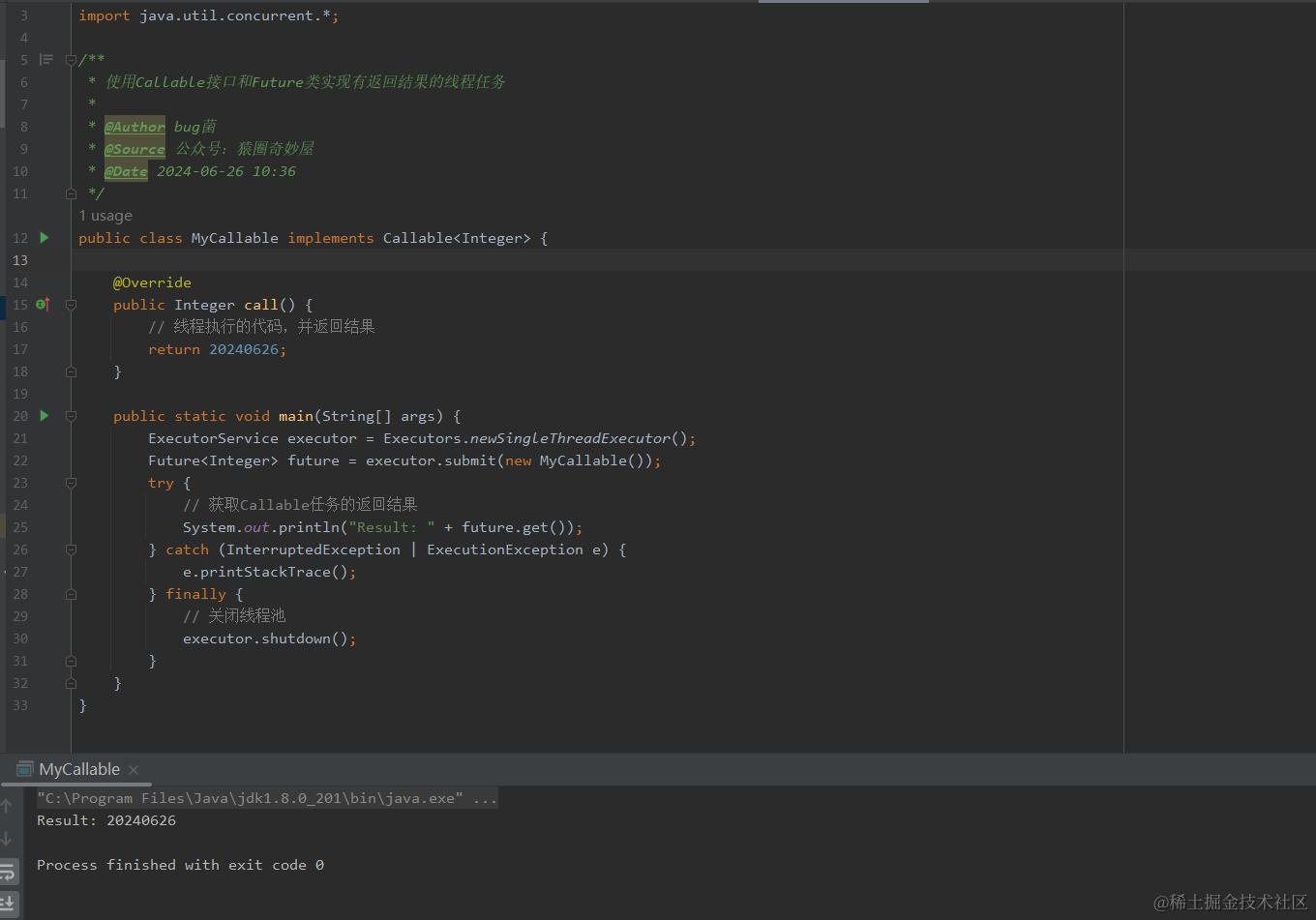 Callable接口,重写了call()方法,返回一个Integer类型的结果。在main方法中,创建了一个单线程的ExecutorService,提交了MyCallable任务,并获取了返回结果。 -