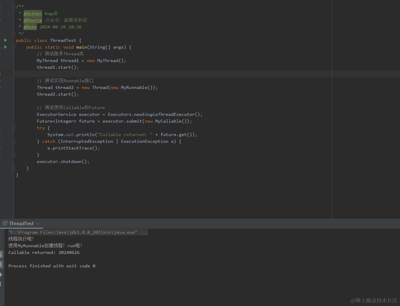 这段代码是一个多线程测试程序,它演示了三种不同的线程创建和启动方式:继承Thread类、实现Runnable接口以及使用Callable和Future。以下是对代码的简要说明: