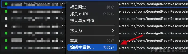 对于需要修改并重新测试某个请求时可以直接选中对应请求,右键-【编辑并重复】,可以快速的修改Header、Query、Body,并测试对应的response。