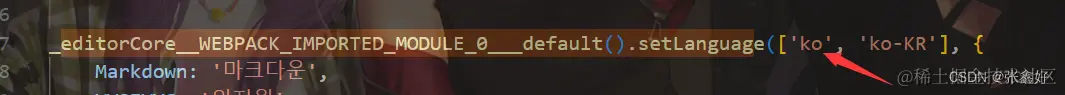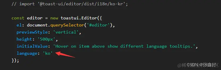 其它的语言js文件进去toast-ui/editor/dist/i18n/****.js的107行那个位置的函数第一个参数都是数组,就中文的js文件(zh-cn.js)里面是个字符串,我就改成数组试试,并且在初始化editor配置language的时候值也是前面数组参数的第一个比如示例是韩文,配的是language: 'ko'