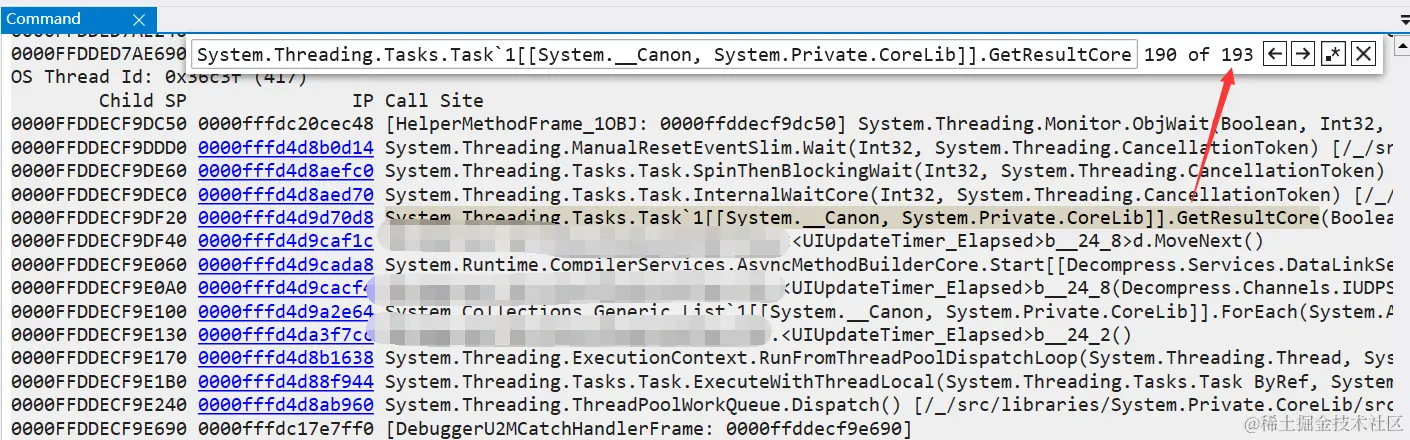 上面这种主动唤醒的机制是 C# 版 PortableThreadPool 做的优化来缓解线程饥饿的,这里有一个重点就是它只能缓解,换句话说如果上游太猛了还是会有请求积压的,但为什么这里没有积压呢? 很显然上游不猛呗,那如何眼见为实呢? 这就需要看 timer 的周期数即可,到当前的线程栈上给扒出来。