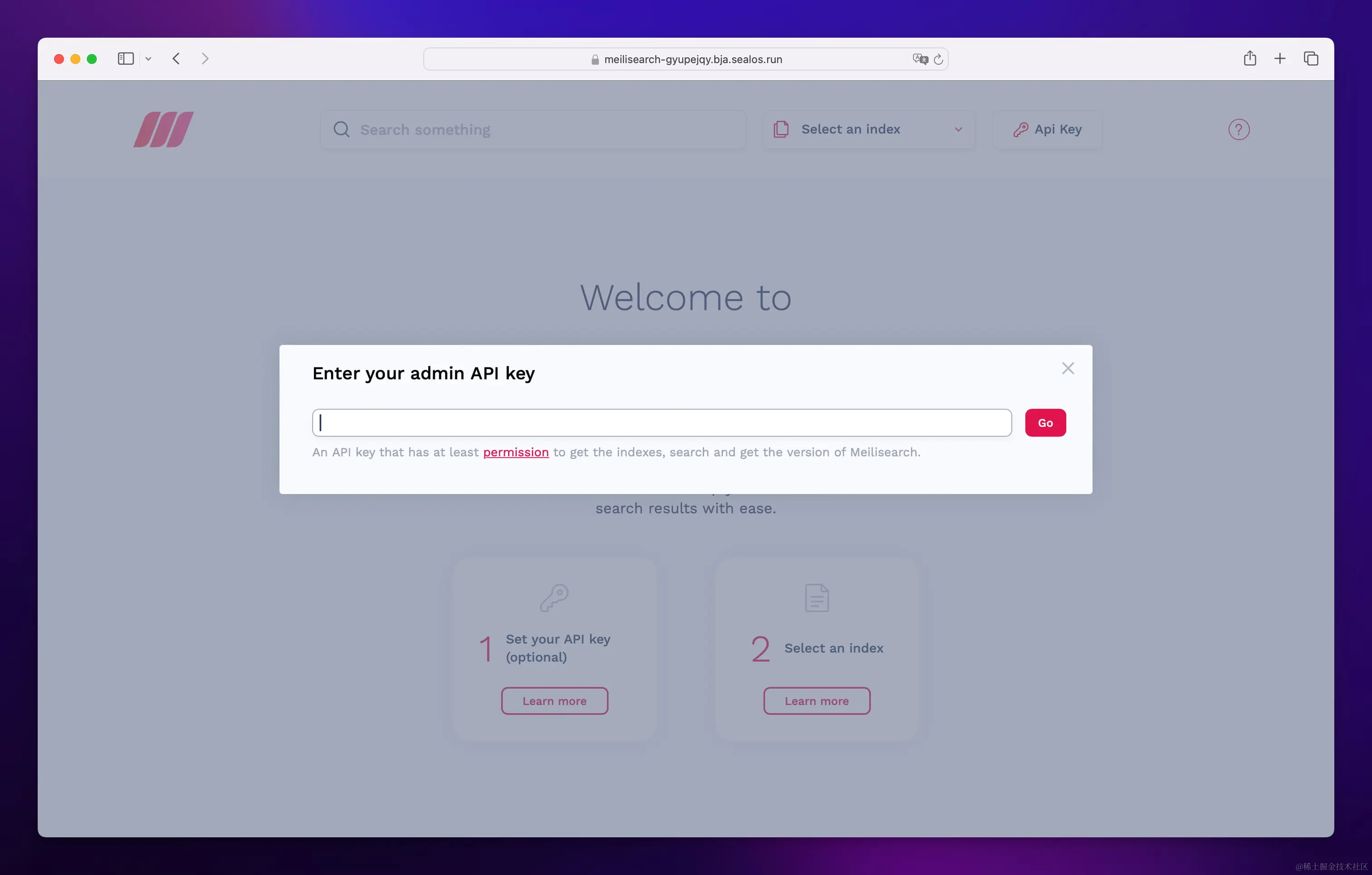 等待应用状态变成 running 之后,直接点击外网地址便可打开 Meilisearch 的搜索预览界面。