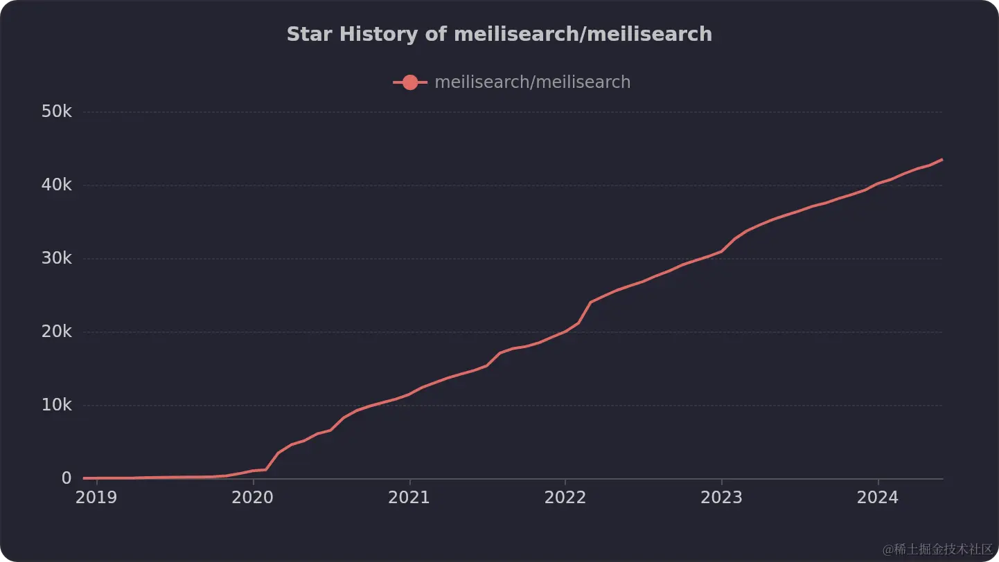 目前 Meilisearch 在 GitHub 上已经获得了超过 40000 颗星。