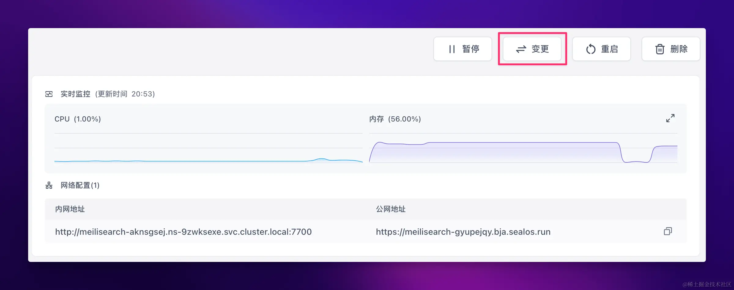 进入 Meilisearch 的应用详情页面,点击右上角的 “变更”:
