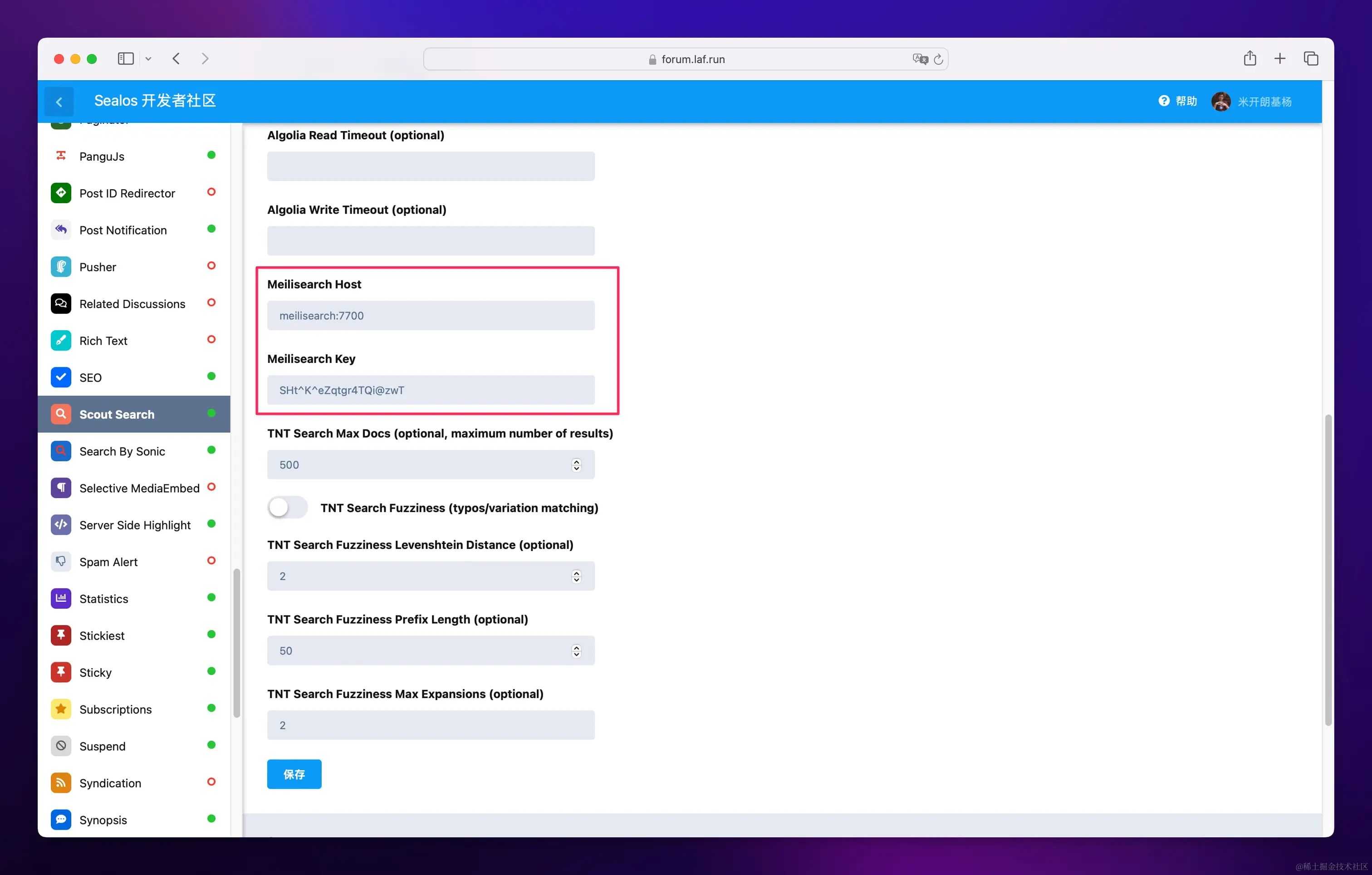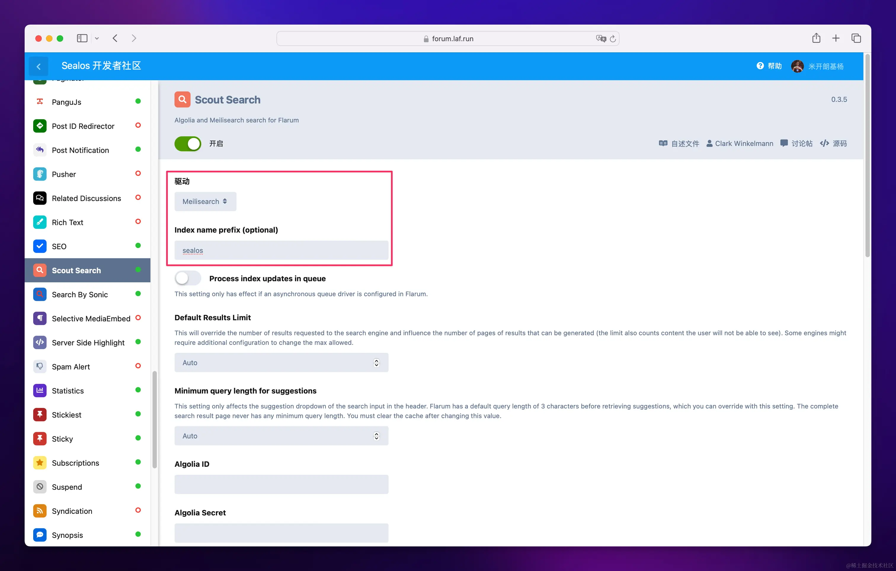 在 Flarum 管理后台中启用 Scout 扩展,并选择 Meilisearch 作为搜索引擎,index 名称可写可不写。