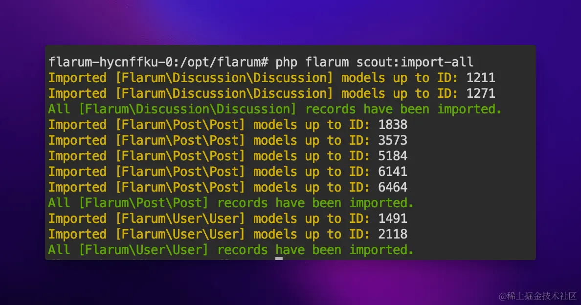 和上面一样,在 Flarum 容器终端中执行以下命令安装 Scout Search 扩展: