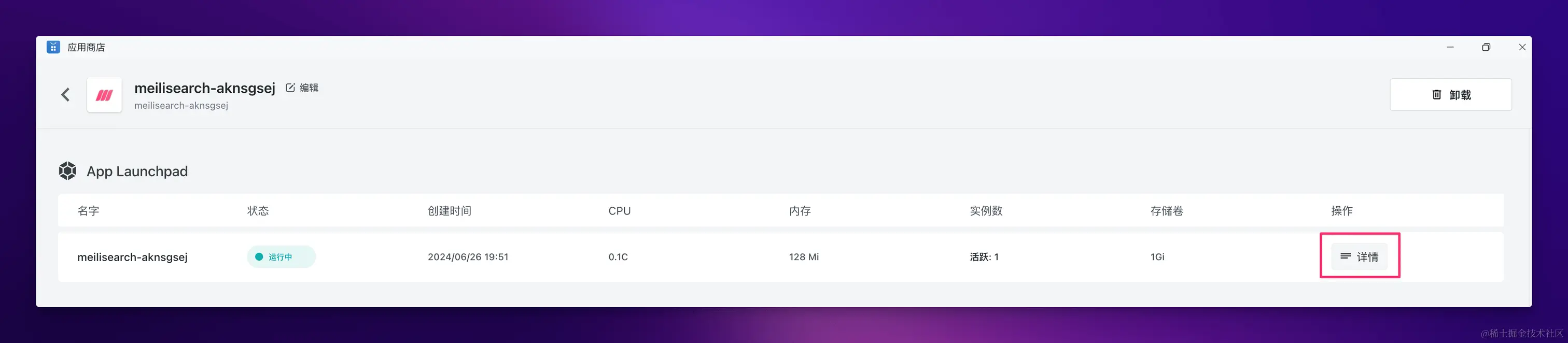 部署完成后,直接点击应用的 “详情” 进入该应用的详情页面。