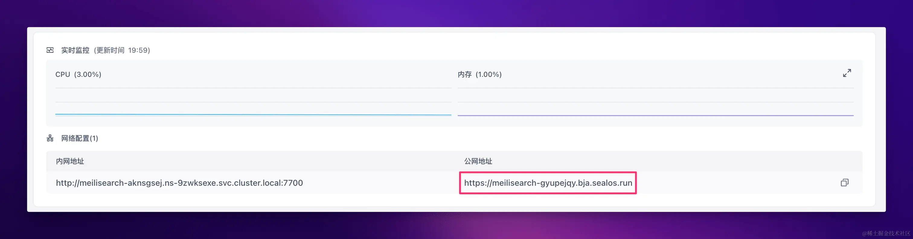 如果你的 Meilisearch 和 Flarum 部署在同一个 Sealos 可用区,那么可以直接使用 Meilisearch 的内网地址,进入 Meilisearch 的应用详情页面,点击内网地址便可复制 Meilisearch 的内网地址,然后作为上面 Scout 插件 Meilisearch Host 的值粘贴进去即可。