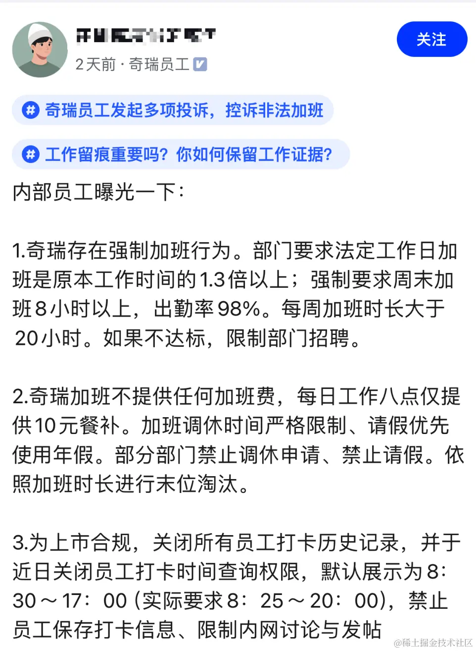 近日,有爆料称奇瑞上海属地员工发起多项投诉,控诉奇瑞非法加班。