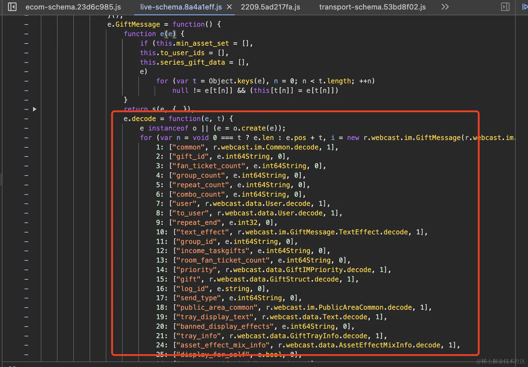 想要看一下每个消息对应的字段内容,就需要看一下对应的函数解析方法是啥,比如这里我们的WebcastGiftMessage消息,对应的函数就是GiftMessage: