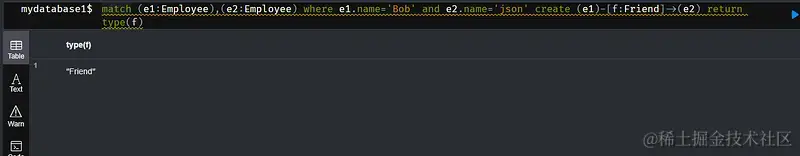 match (e1:Employee),(e2:Employee) where e1.name='Bob' and e2.name='json' create (e1)-[f:Friend]->(e2) return type(f)