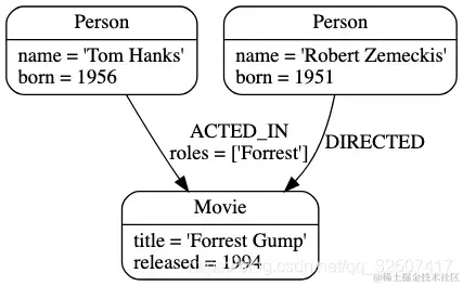 Relationship连接两个节点,使得组织成列表、树、图等更为复杂的结构。 比如下图表示Tom Hanks在电影Forrest Gump中饰演角色Forrest Gump,其中 饰演角色 就是Tom Hanks和Forrest Gump的关系/Relationship。