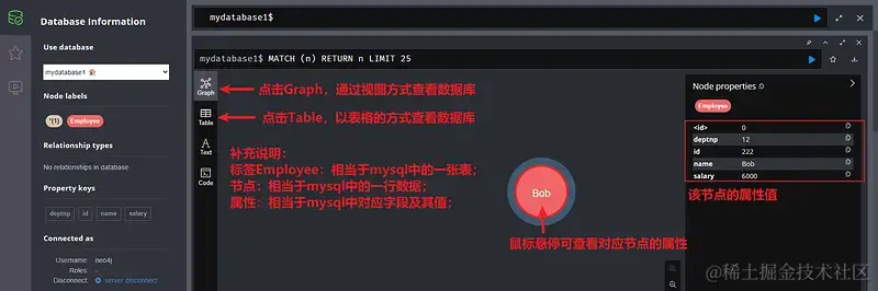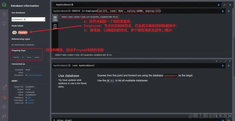 Employee为:节点对应标签(相当于myslq中的一张表), e和Employee放在小括号里面(),中间用冒号表示关系;后面把所有属性(相当于Myslq中表的列名)以键值对的形式放在大括号’{}‘里面, 依次写出属性名称:属性值, 不同属性用逗号’,'分隔;