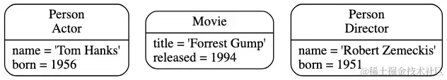 Person有name和born属性,Movie有title和released属性,ACTED_IN有roles属性。