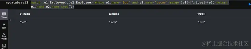 match (e1:Employee),(e2:Employee) where e1.name='Bob' and e2.name='Lucer' merge (e1)-[l:Love]-(e2) return e1.name,e2.name,type(l)