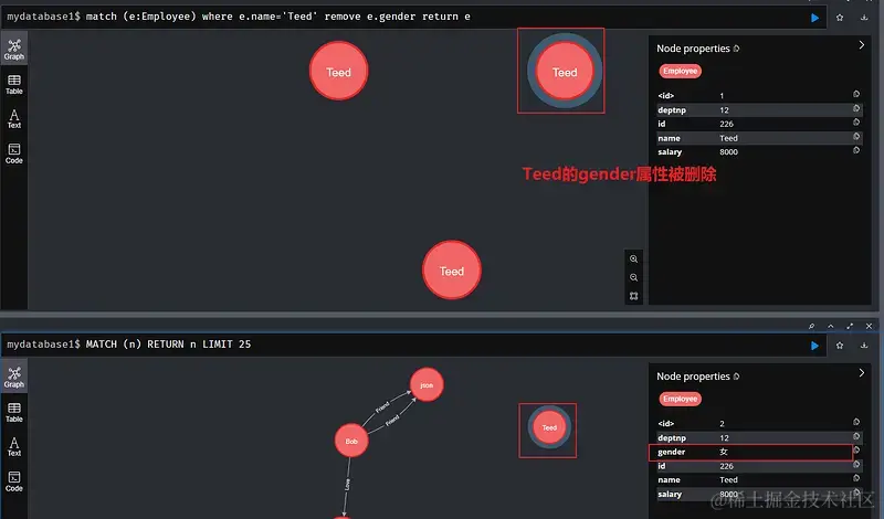match (e:Employee) where e.name='Teed' remove e.gender return e