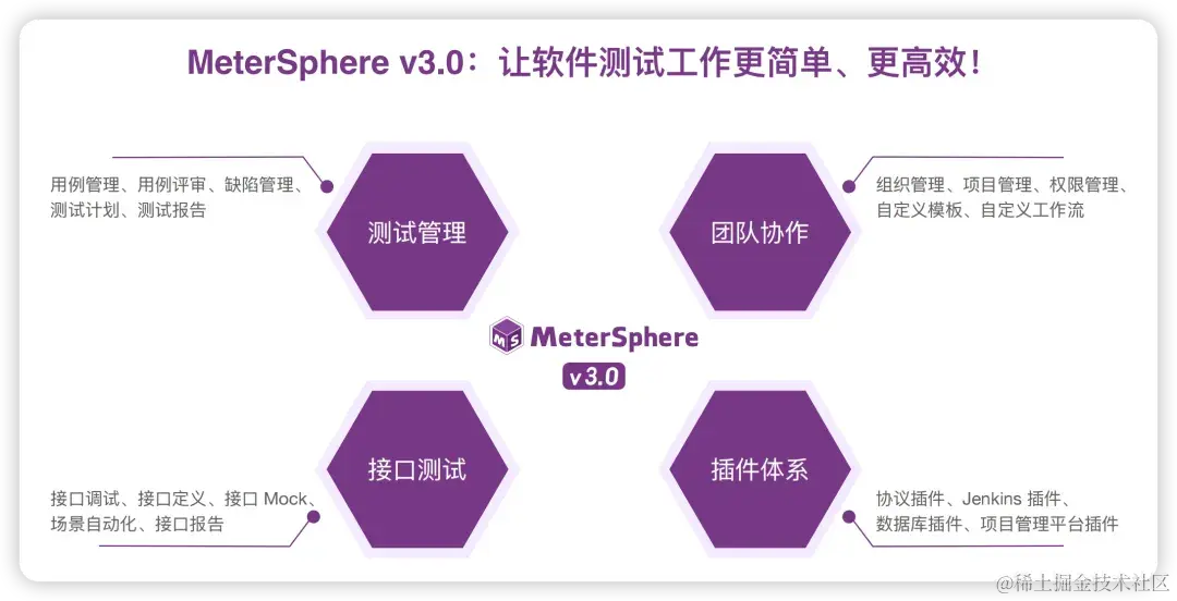 在团队协作方面,针对目前企业软件测试团队所面临的测试工具不统一、测试用例管理分散、测试执行效率不高等问题,MeterSphere v3.0在测试协同和测试执行方面进行了针对性的设计和优化;在插件体系方面,MeterSphere v3.0提供多种类别的插件,用户可以按需取用,快速实现MeterSphere测试能力的扩展以及与DevOps流水线的集成。