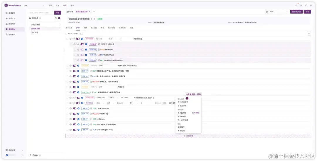 MeterSphere v3.0接口测试的场景自动化功能提供多元的步骤组件,用户可以通过系统中维护的接口、用例、场景、脚本、文件等资源进行业务场景的编排,配合逻辑控制组件以及CSV组件的使用,实现复杂业务场景的自动化测试。