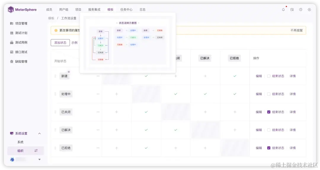 MeterSphere v3.0采用了“系统-组织-项目”的分层设计理念,为用户提供完整的组织管理、项目管理和权限管理能力。在通用工具的基础上,MeterSphere v3.0提供了充分的团队协作能力,支持组织、项目的个性化配置,例如自定义模板、自定义工作流等。