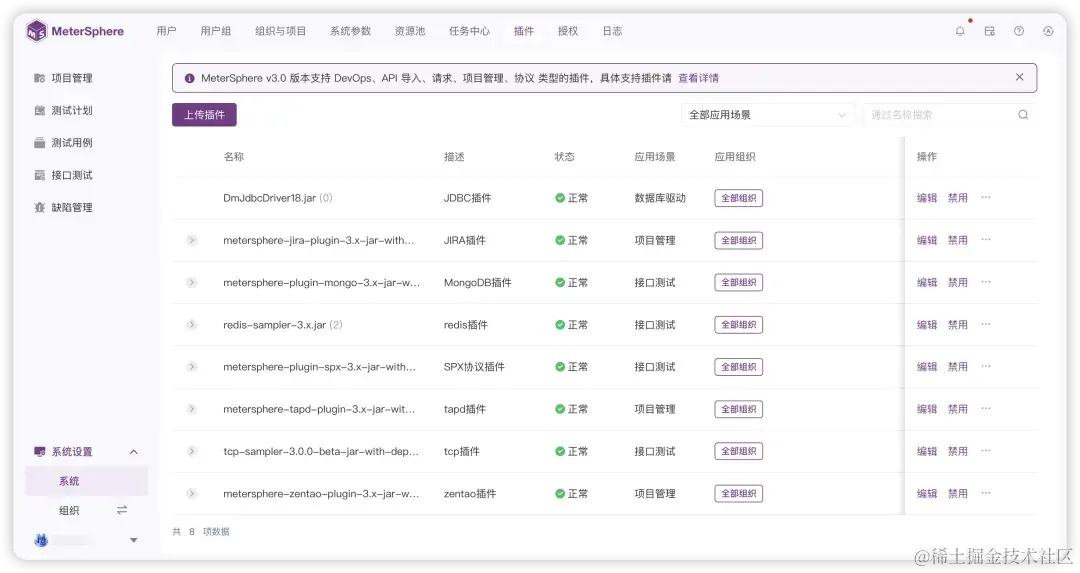 在强大功能性的基础之上,MeterSphere v3.0还提供了高度灵活、可扩展的插件体系。用户可以根据自身需求按需取用,实现MeterSphere测试能力的扩展以及与DevOps流水线的集成。