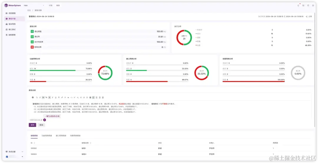 此外,MeterSphere v3.0的测试报告功能支持展示测试过程中多种维度的关键指标,例如测试通过阈值、测试通过率、执行完成率、缺陷总数等。与此同时,MeterSphere v3.0还可以针对测试计划中不同测试类型的用例进行执行分析和结果分析,并且提供一键生成报告总结的能力。