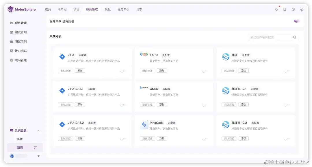 目前,MeterSphere v3.0支持接口协议类插件(例如TCP、MQTT等)、Jenkins插件、数据库插件(例如Oracle、SQLServer等)、项目管理平台类插件(例如TAPD、Jira等)。同时,MeterSphere开源测试工具还提供插件开发指南,方便更多开发者和用户参与到插件的开发和使用中来,共同促进MeterSphere插件生态系统的建设和发展。