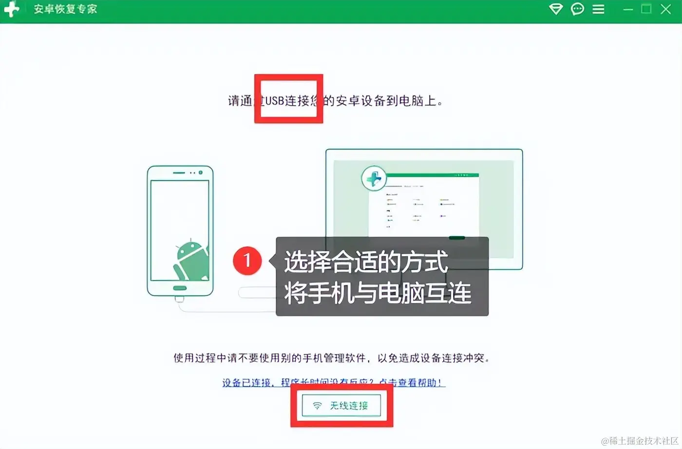 步骤2:使用数据线或者无线的方式,将你的安卓手机连接到电脑上。然后选择要恢复的数据类型,开启扫描。