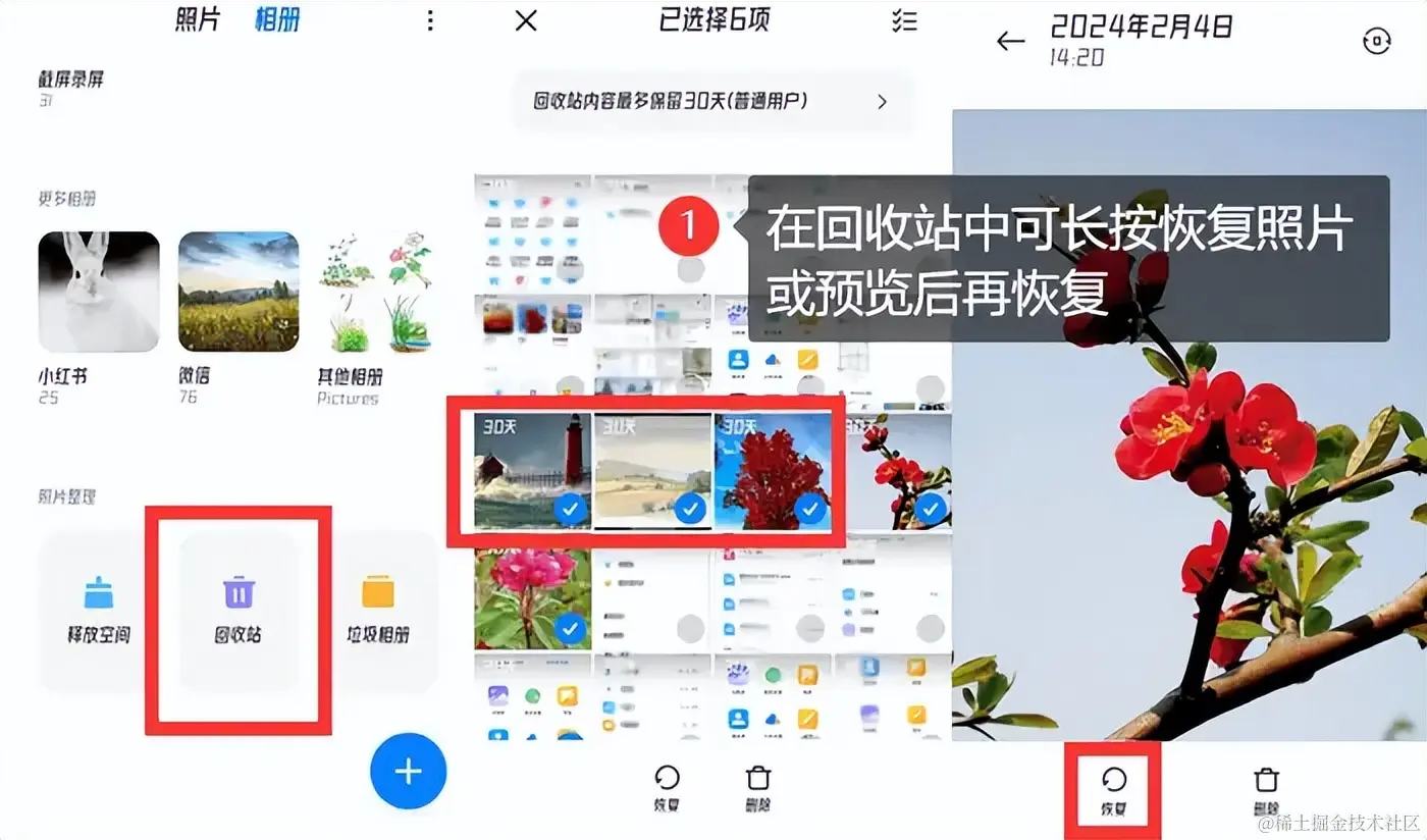 回收站就像是一个神奇的宝箱,里面装满了我们不小心丢失的记忆。当我们不小心删除了照片时,它们并没有真正消失,而是被放进了这个神奇的宝箱中。那么,有了回收站后,删除的照片如何恢复呢?步骤很简单,只需要在手机相册中找到回收站并进入,在需要的照片中点击恢复就可以啦!