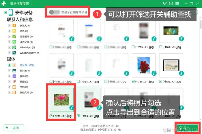 步骤3:在数据列表中,借助筛选开关查找照片,确认无误后,勾选需要恢复的照片,点击“导出”按钮,照片就会被恢复到指定的位置。