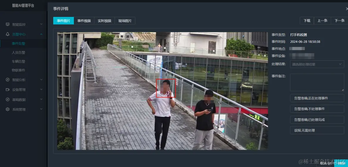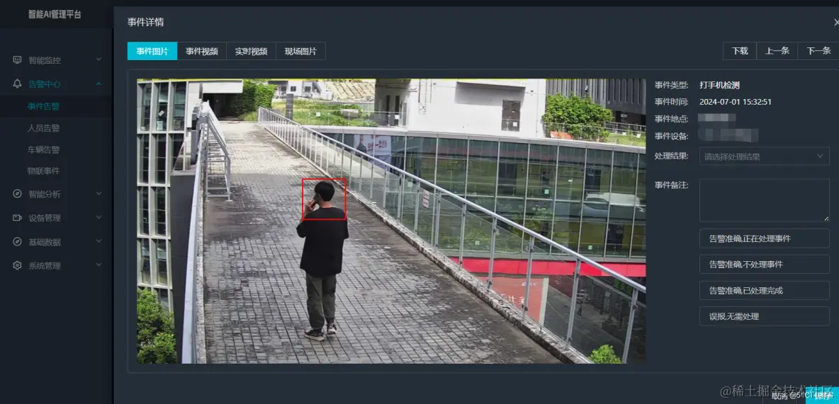 手机检测:在确定了人体的位置和姿态后,使用专门的手机检测算法来检测人是否持有或正在操作手机。这可能涉及到手部的姿态识别、手部位置的跟踪等技术。
