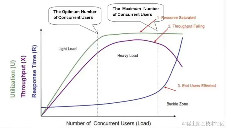 第一个拐点:The Optimum Number of Concurrent Users(最佳并发用户数),在 Light Load 和 Heavy Load 两个区域交界处的并发用户数。代表最优并发用户数:既不会造成资源的浪费,也可以满足现有的需求
