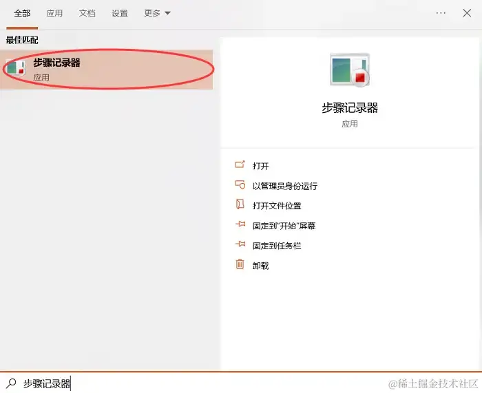 步骤1:按下“Windows”键,然后输入 “步骤记录器” ,右键点击搜索结果,选择打开。