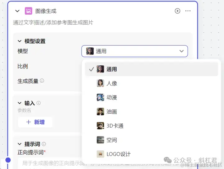 看一下这个节点的细节,在模型这里有很多的风格,如果我们想生成LOGO,我们就选择LOGO设计。
