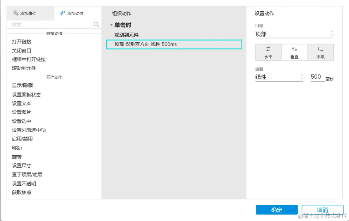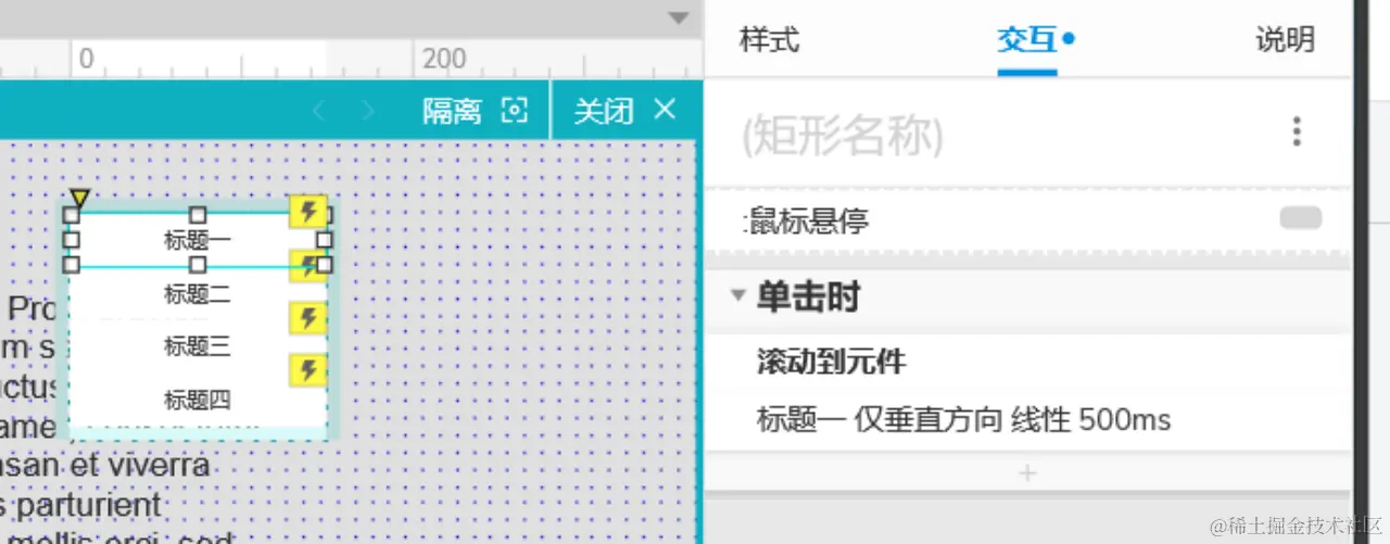 【动态面板】设置【单击】 【滚动到原件】,目标为【顶部矩形】