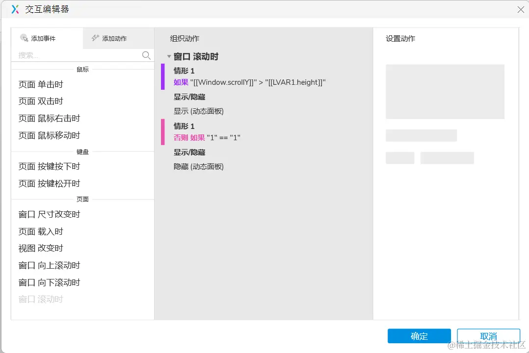 我们点一下画布的空白处,给页面添加【窗口滚动时】的交互,当窗口垂直滑动的距离大于顶部矩形高度的手则【显示】 【动态面板】 ,否则就【隐藏】