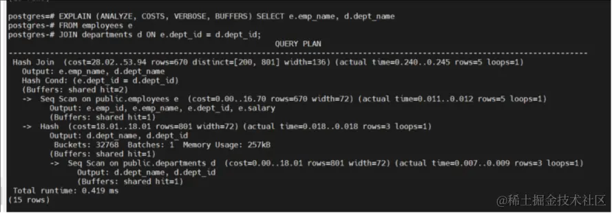 EXPLAIN (ANALYZE, COSTS, VERBOSE, BUFFERS) SELECT e.emp_name, d.dept_name