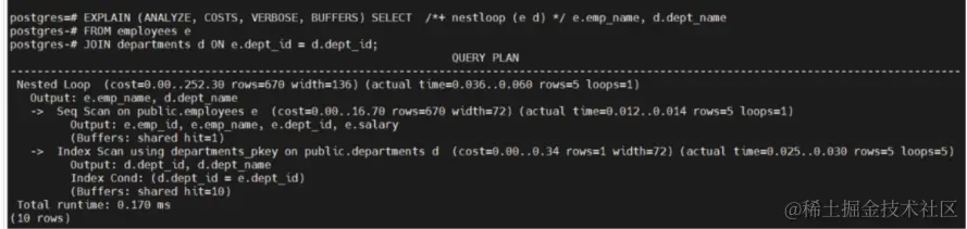 EXPLAIN (ANALYZE, COSTS, VERBOSE, BUFFERS) SELECT /*+ nestloop (e d) */ e.emp_name, d.dept_name