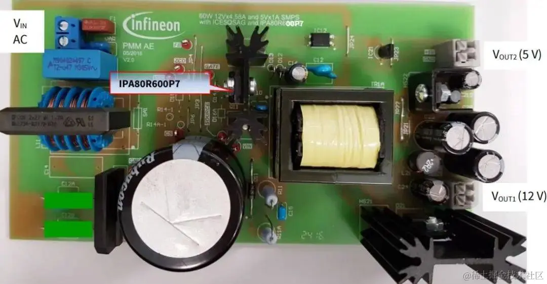 为了确定共模电感的应用,首先要明白共模噪声是怎么出现的:如图Fig.2所示(Infineon一款60W开关电源参考设计:DEMO_5QSAG_60W1),输入端为市电输入85~300Vac,电源端口上接线L、N和参考地之间构成了共地,实际上市电输入还有一根地线Green Line接到此参考地对接到物理地上。现在L线和N线构成电源回路并且跨接在此Flyback变压器的原边,作为主功率开关管的Q11的规格选用了800V的超节MOS管IPA80R600P7,其Rds(on)最大限额为600mΩ,为了有限散热一般会将散热媒介(铝散热鳍片)贴附在其外壳上,这样就增加了其高压管脚端对地的杂散电容,形成容性耦合将高压高频的输入端电压耦合形成噪音性质的电位势,在输入端口的L线和N线上通过参考地也会接收到此电位势,也即形成了共模噪声源。