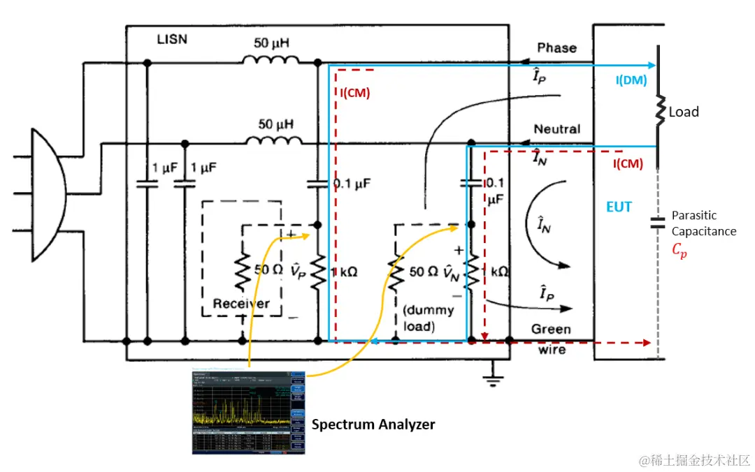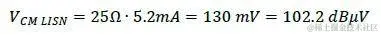 因此在LISN端口上的传导测试接收机(频谱分析仪)将接收到的共模噪声电压幅值将会是: