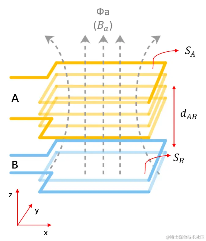 而位于线圈B上的每一点位置上由线圈A所分布的磁矢位是(在中心间距为dAB的平均情况下):