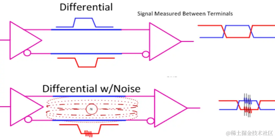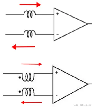 如图 Fig.5 所示,高速信号线一般采用差分对信号进行传输,信号线上存在电阻,杂散电容和分布电感,通过双绞线的形式可以有效地降低杂散电容但是无法去除分布电感,因此在接收端上存在差模输入电感,线路上的耦合电流会形成信号图上的噪声。这些噪声基于传输线的对称性将接近等量的分布在接收机的两端,现在在接收端输入位置放置共模电感,则接近等量的噪声将通过共模电感的绕组耦合产生抵消,从而极大的降低耦合噪声,也即电流补偿作用使得接收端输入噪声降低。