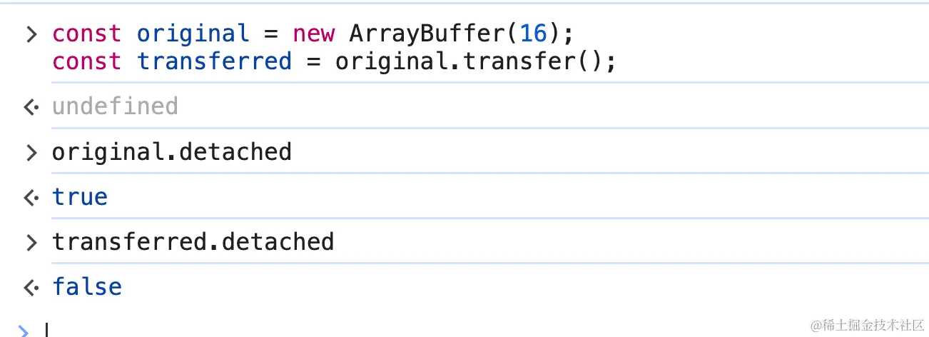 detached属性是一个访问器属性,其 set 访问器函数是undefined,这意味着你只能读取此属性。该属性的值在创建ArrayBuffer时设置为false。如果ArrayBuffer已被传输,则该值将变为true,这将使该实例从其底层内存中分离。一旦缓冲区被分离,它就不再可用。