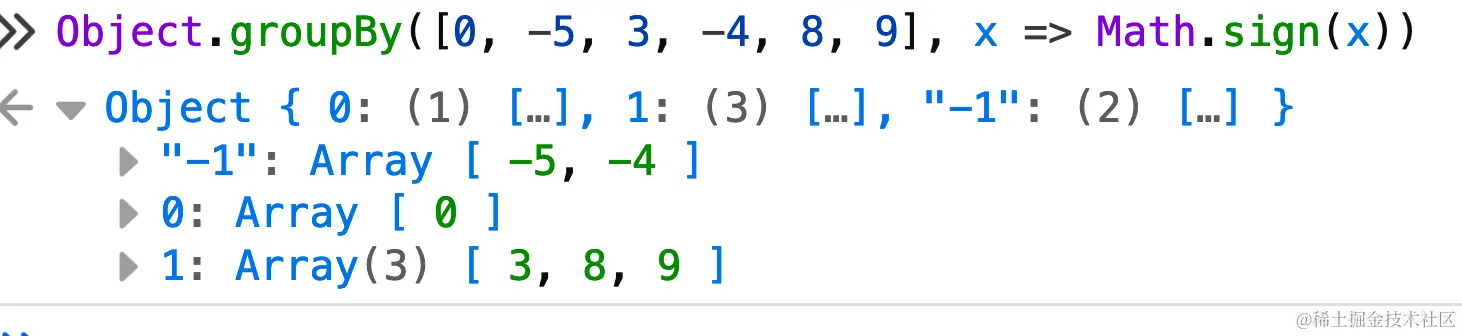 Object.groupBy([0, -5, 3, -4, 8, 9], x => Math.sign(x))