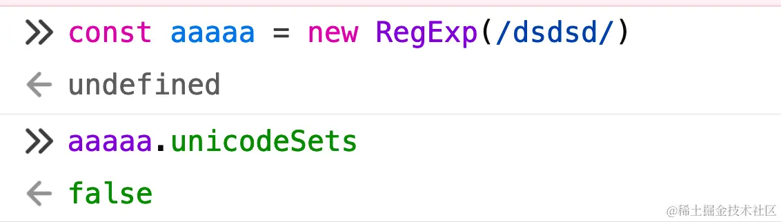 如果使用 v 标志, RegExp.prototype.unicodeSets 的值为 true ;否则, false 。