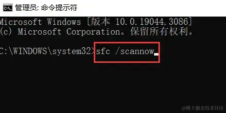第二步:在命令提示符中输入 “sfc /scannow” ,按下回车键,等待系统文件检查工具完成扫描和修复。