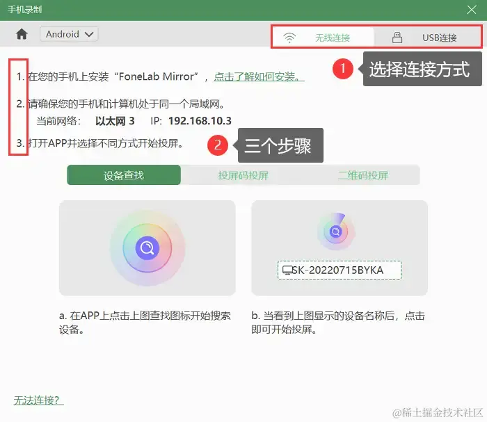 步骤2:OPPO手机先选择安卓模式,然后再选择连接方式,有无线连接与USB连接供您选择,根据步骤提醒进行连接。