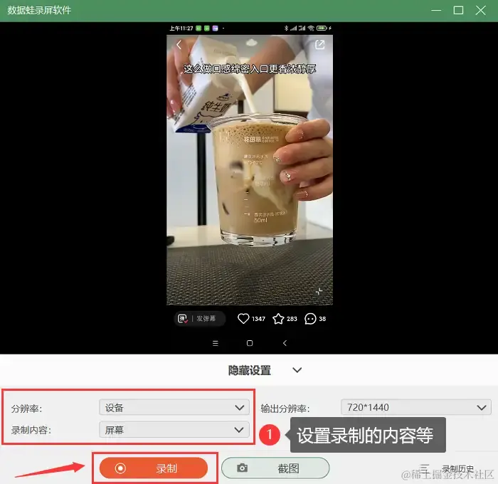 步骤3:连接成功后,就能把手机屏幕投屏到电脑上了,调节好录制的内容,点击 【录制】 即可进入录屏。