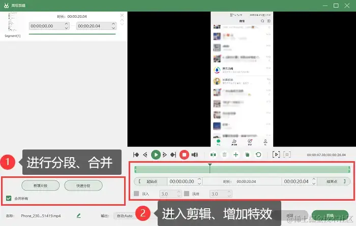 步骤4:录制完成的内容,还能进入 【高级剪辑】 对您录制的视频进行分段、合并、剪辑、增加特效等。