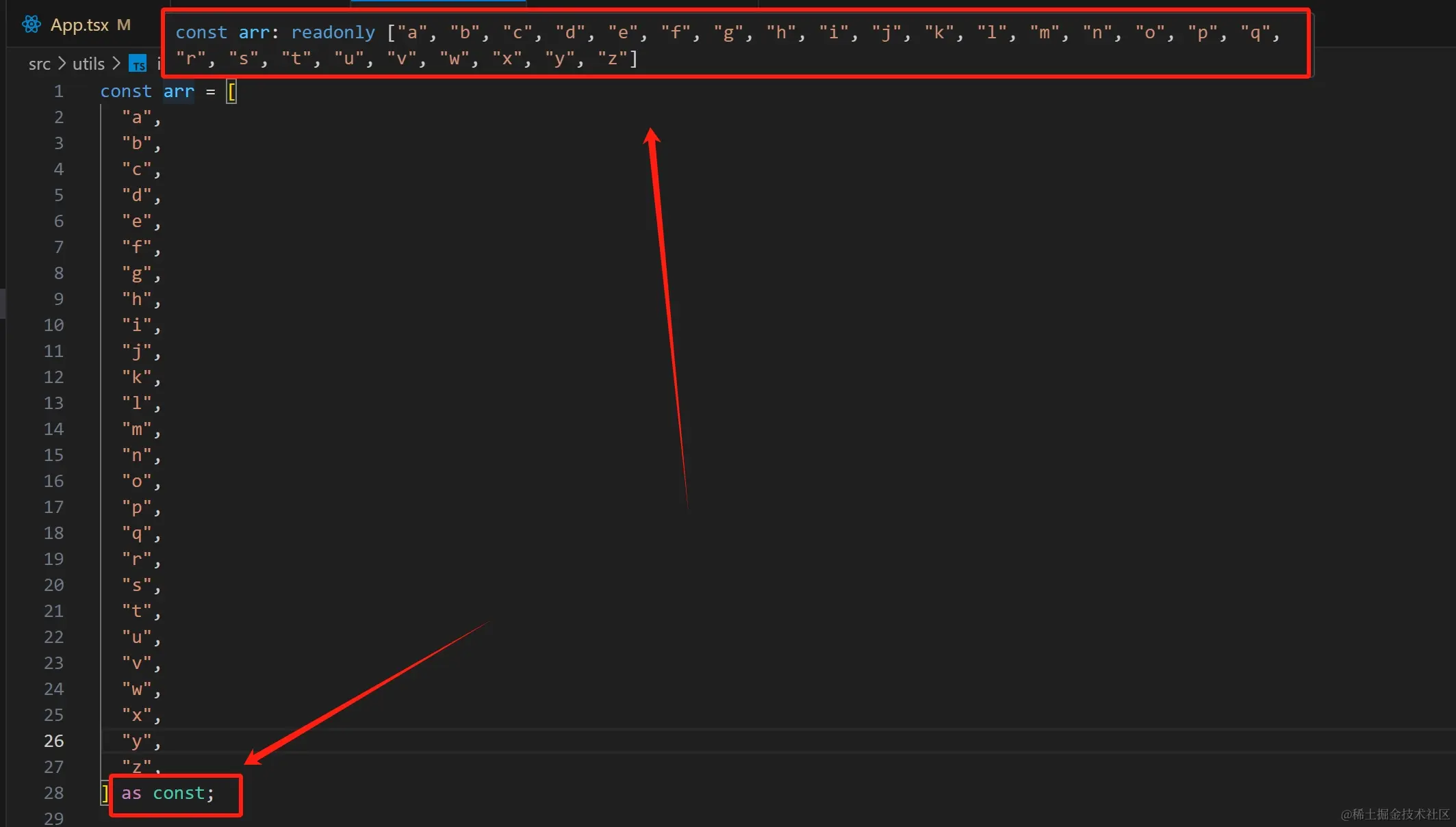 先不说这样的写法很笨,写的时候就已经很ex了,我们希望的是Strs可以根据上面arr的值来自动生成一个联合类型,这时我们可以有一个技巧来解决这个问题,就是先将str转换为元组: